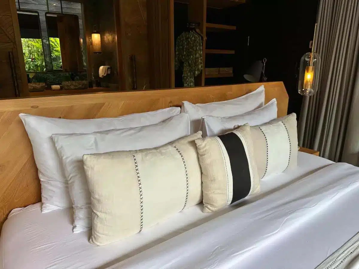 The bed is super comfortable and offers stunning views of the lush green garden and the pool.