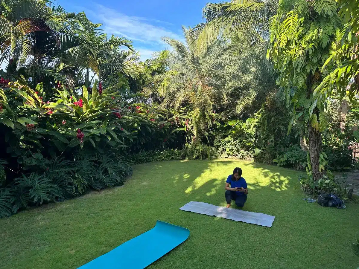 When the weather allows, yoga takes place in the hotel’s garden. In case of rain, the yoga class is relocated to either the restaurant area or the guest’s villa.