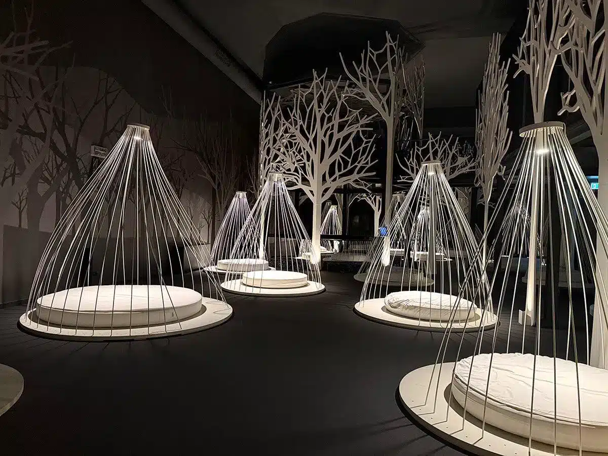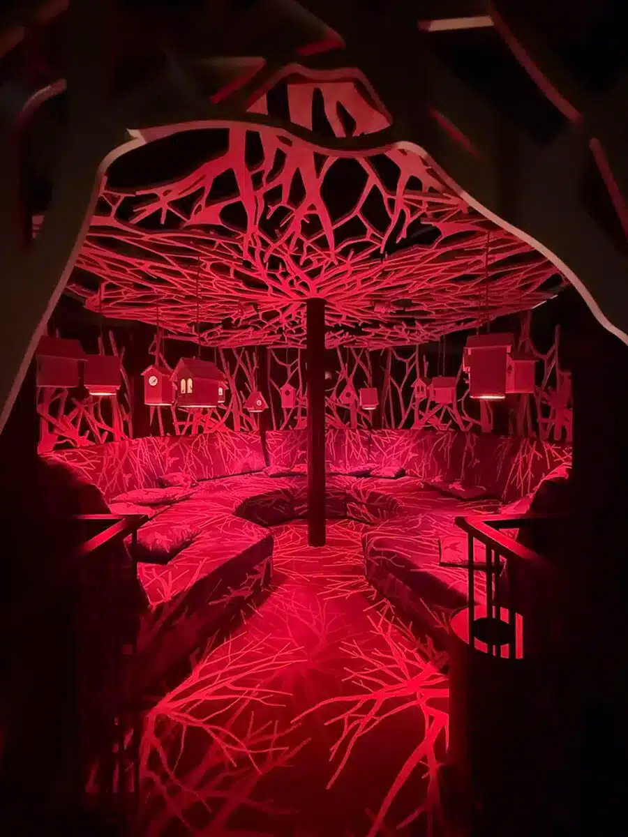 There was a whimsical “birdhouse” room, softly filled with red, with birdsong playing and a circular couch made for sinking into.