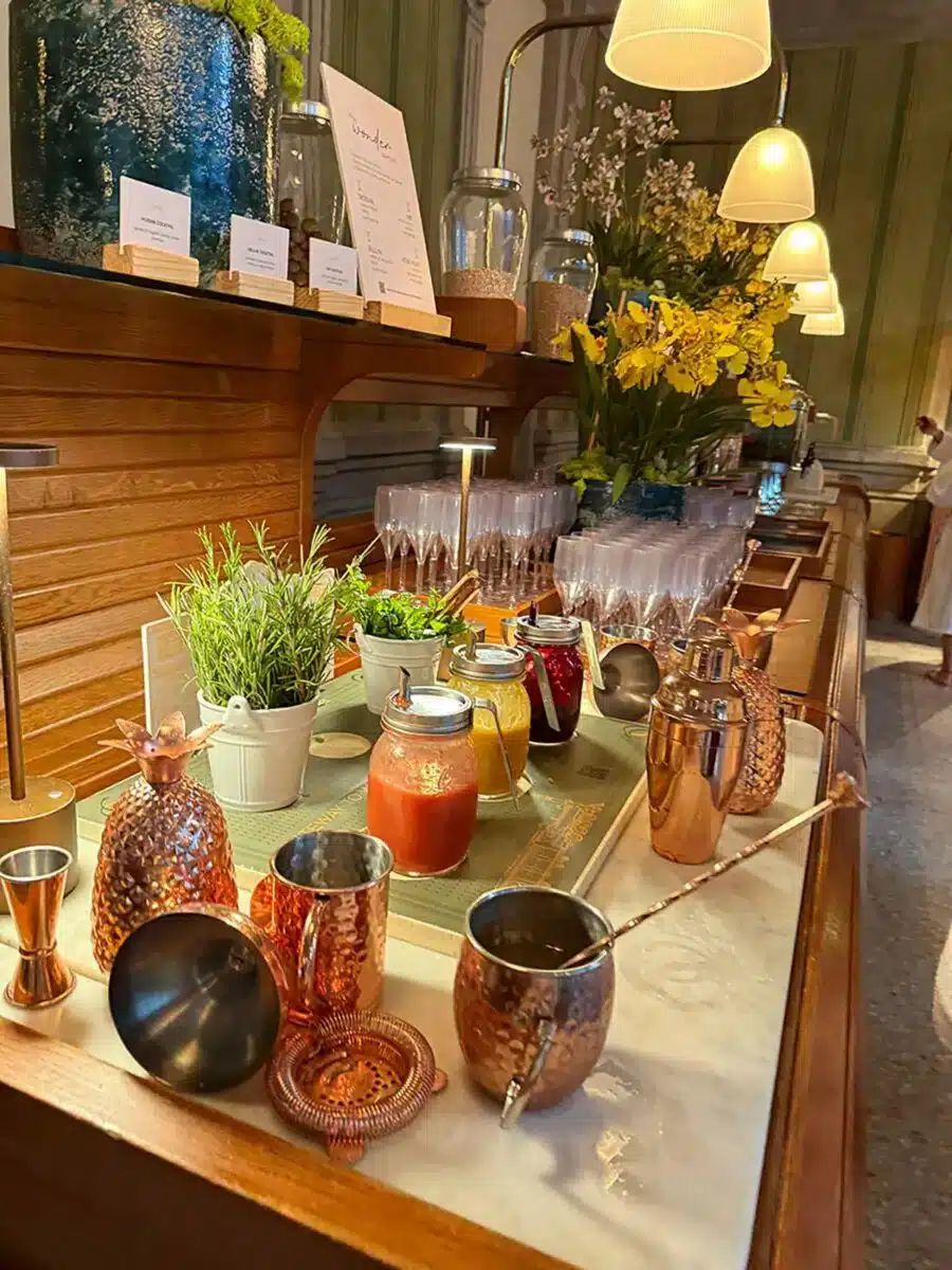 At 6:30 pm, we made our way straight to the buffet, where flutes of prosecco and small jars of fruit, cheese, and small savory bites waited to feed our empty bellies.